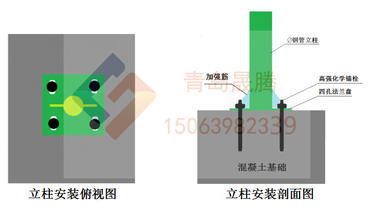 3.3組裝好一部分框架就一起扶起,第一個安裝立柱到定點位置后采用化學錨栓將法蘭盤固定孔位固定住,注意化學錨栓的螺帽不要擰死,然后依次順序固定;